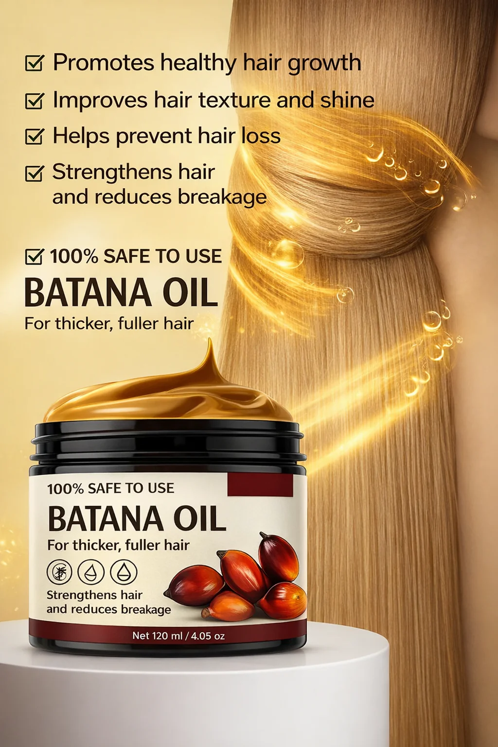 Thanks to its richness in fatty acids and antioxidants, Batana oil activates hair follicles, thus promoting rapid and healthy regrowth. It is particularly recommended for people suffering from hair loss or thinning areas.