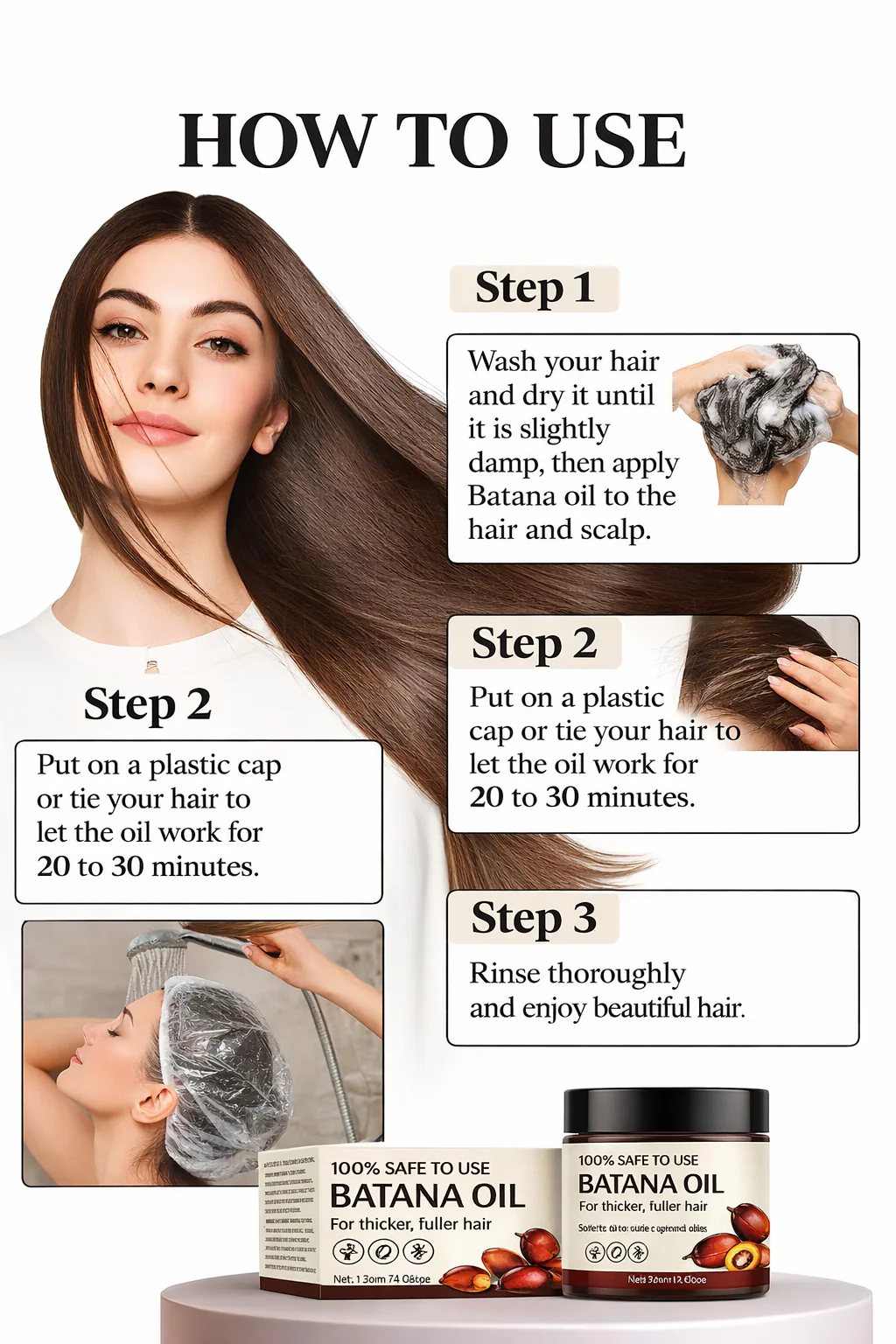Warm a few drops in the palm of your hand, apply directly to your scalp, and massage gently. Leave on for a few hours or overnight as a hair oil treatment, then wash with a mild shampoo. With regular use, it visibly transforms the health of your hair.